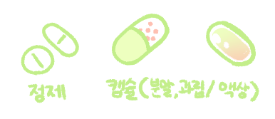 알약의 경우 종류는 1.정제, 2. 캡슐(분말,과립형) 3.캡슐(액상형) 으로 나뉩니다.